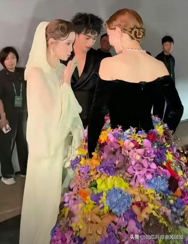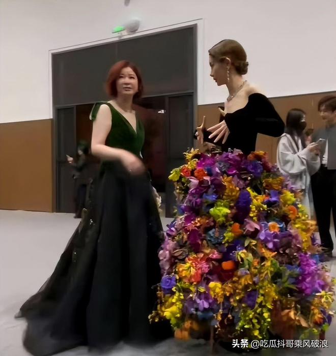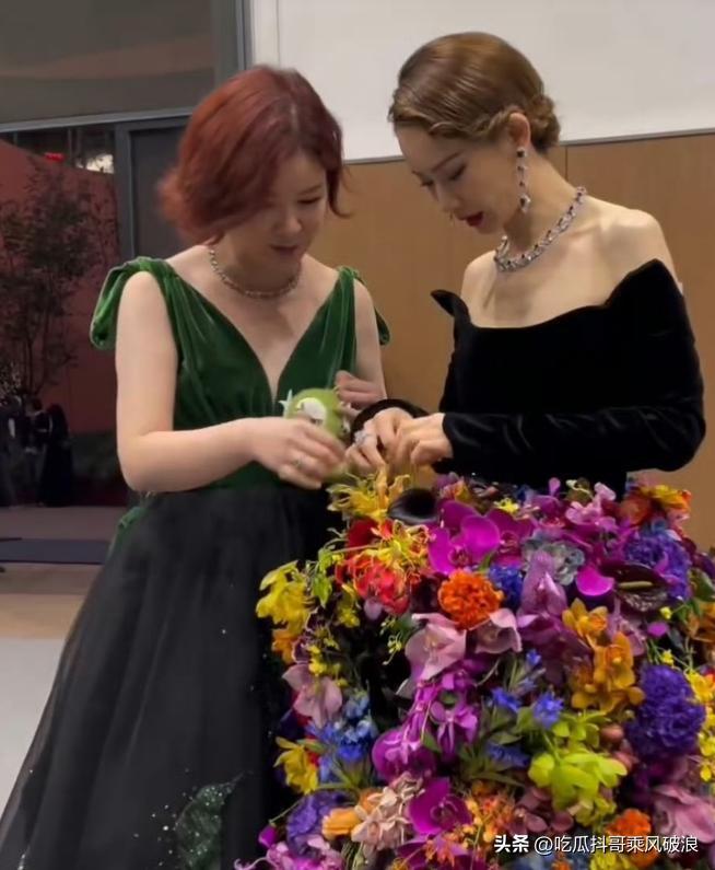还得是戚薇,上半身黑色拉丝绒露肩紧身衣,下半身是由真花朵制作而成的姹紫嫣红礼裙。